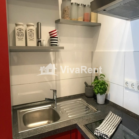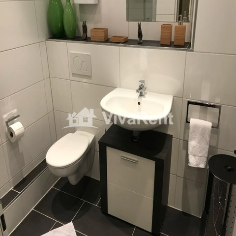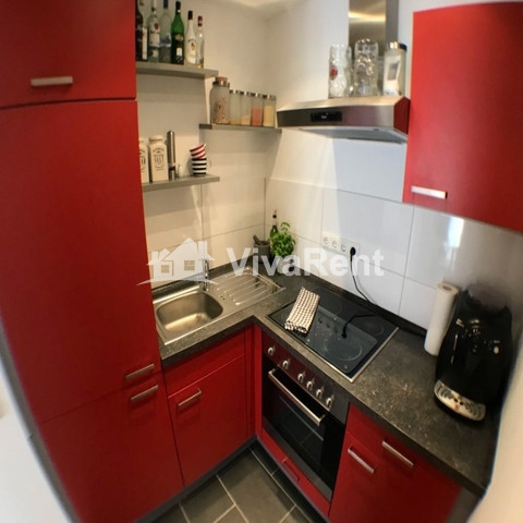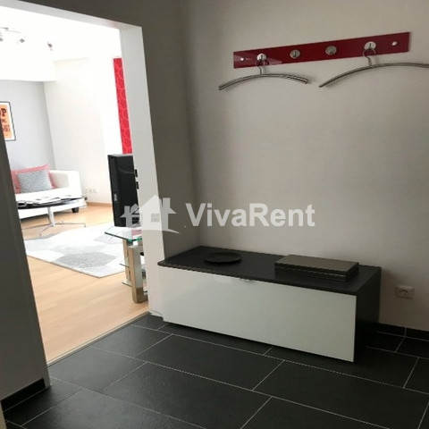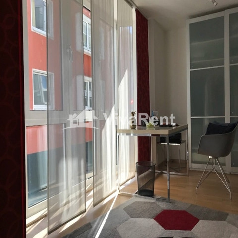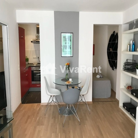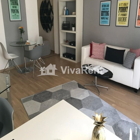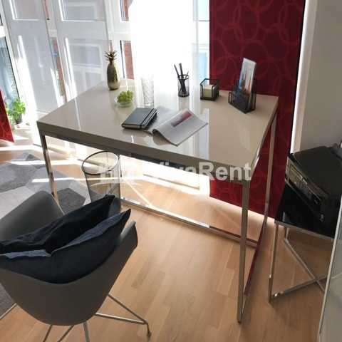 Der Höhepunkt dieser Wohnung ist der geräumige Wohn- und Arbeitsbereich mit raumhohen Fenstern. Ein Esstisch für 4 Personen, ein Loungebereich und ein heller Arbeitsplatz nutzen den Raum voll aus. Ein separates Schlafzimmer mit Queensize-Bett, eine voll ausgestattete Küche und das moderne Badezimmer und der Flur runden das Bild ab.